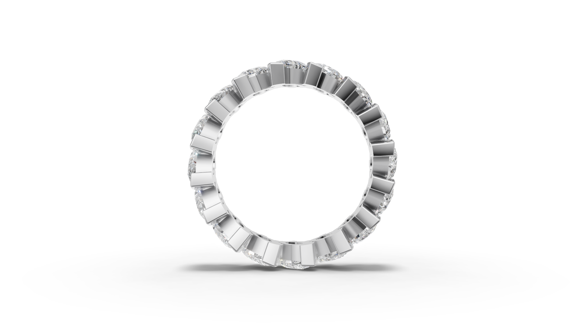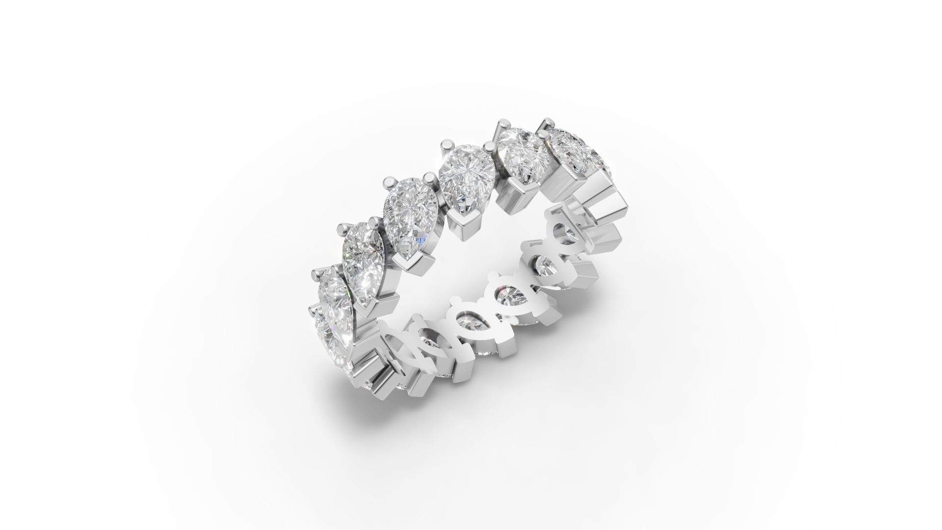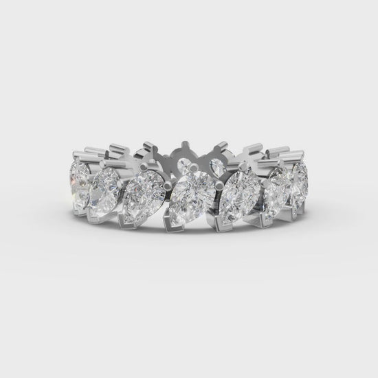 Make a bold statement with the Emery ring. This extraordinary ring features a seamless row of pear shaped moissanites each set slightly askew to create a dynamic, offbeat look. The asymmetrical arrangement adds a modern twist to the classic eternity band, perfect for those who seek a bold statement piece that redefines timeless style.