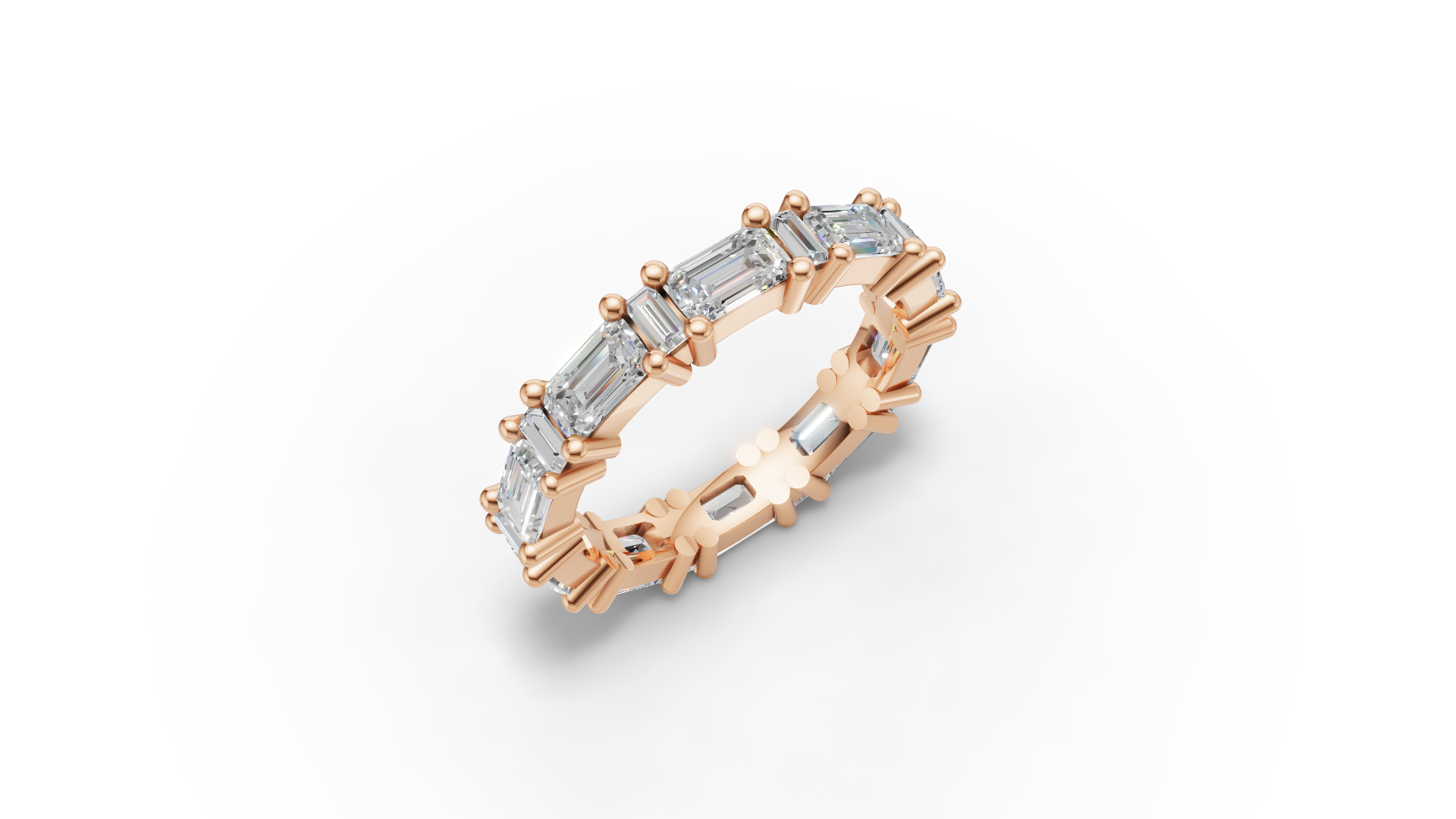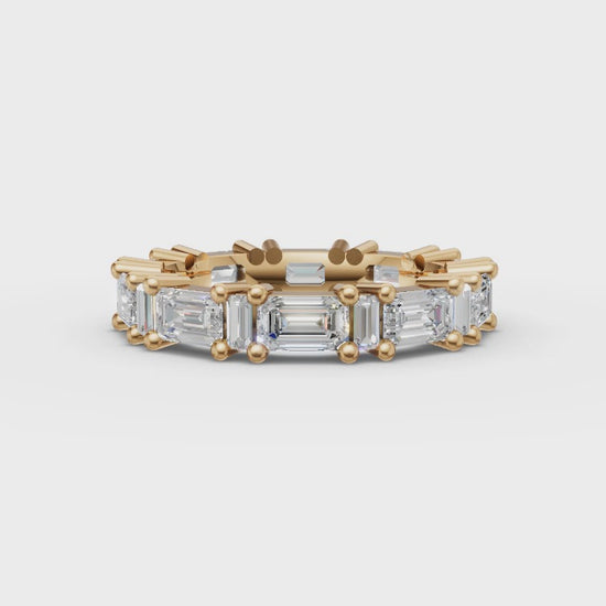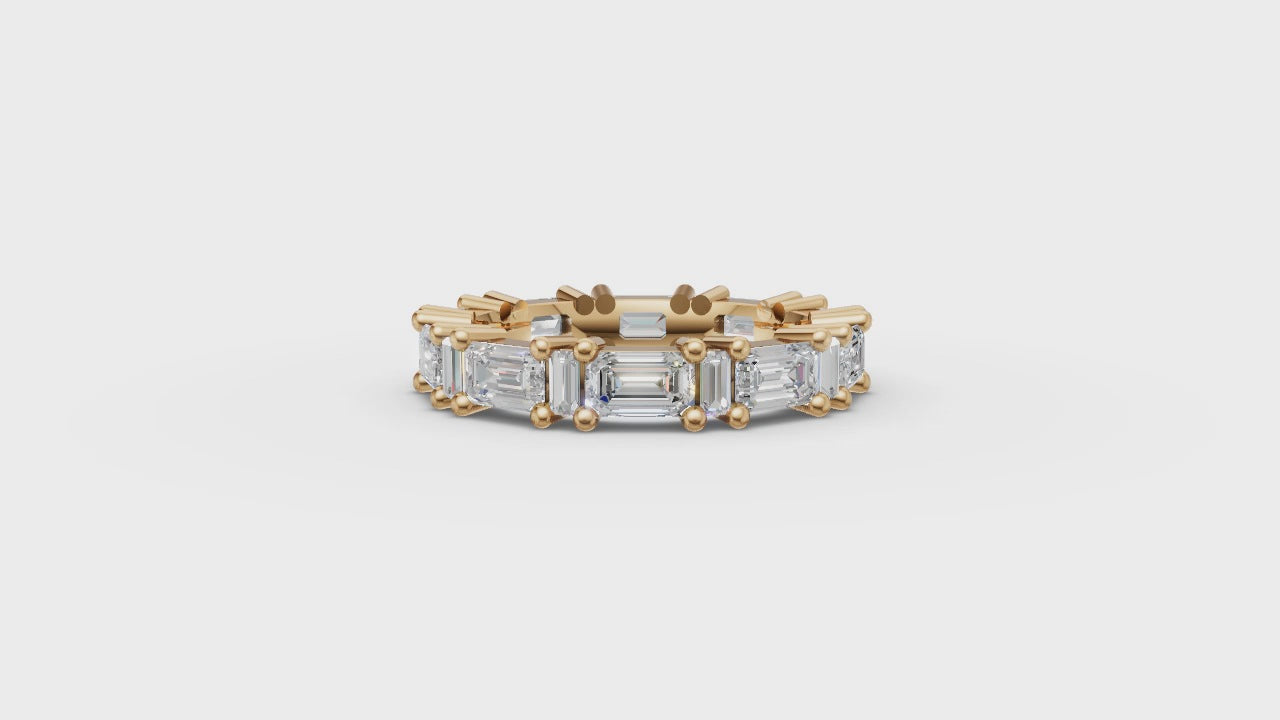 Elevate your style with the striking Esme Ring. Designed to dazzle, this ring is a masterpiece of design, featuring a playful mix of emerald-cut and baguette moissanites that dance in the light. This ring is a true standout for anyone who loves a blend of bold creativity and timeless charm.