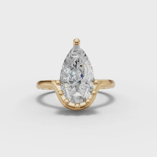 The Matilda Pear-Cut Engagement Ring exudes timeless elegance with a contemporary twist. Showcasing a radiant pear-cut moissanite stone, the ring's design features a unique crown-like prong setting that elevates the stone, maximizing its brilliance and presence.