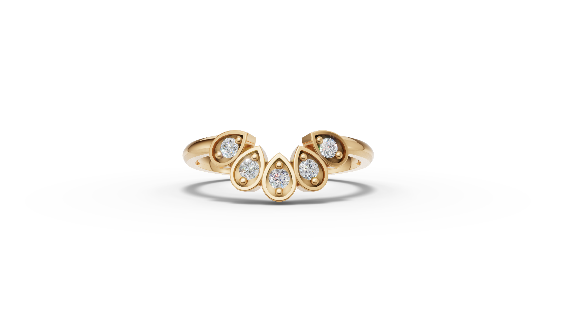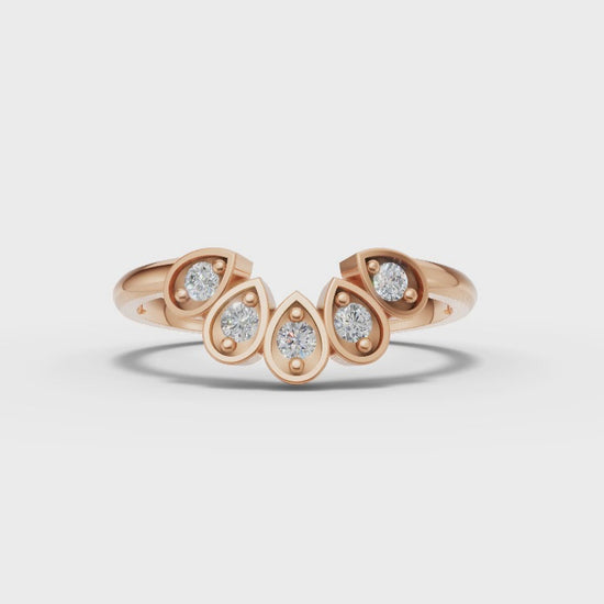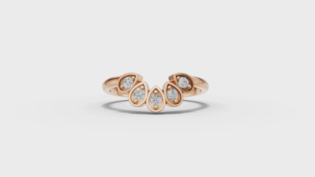 Our Hazel Ring features five brilliant round moissanites set in delicate teardrop-shaped bezels. The arrangement of the stones in this fan-like formation creates a beautiful blend of softness and sparkle, offering a truly distinctive look. Perfect for those who love a touch of artistic flair.