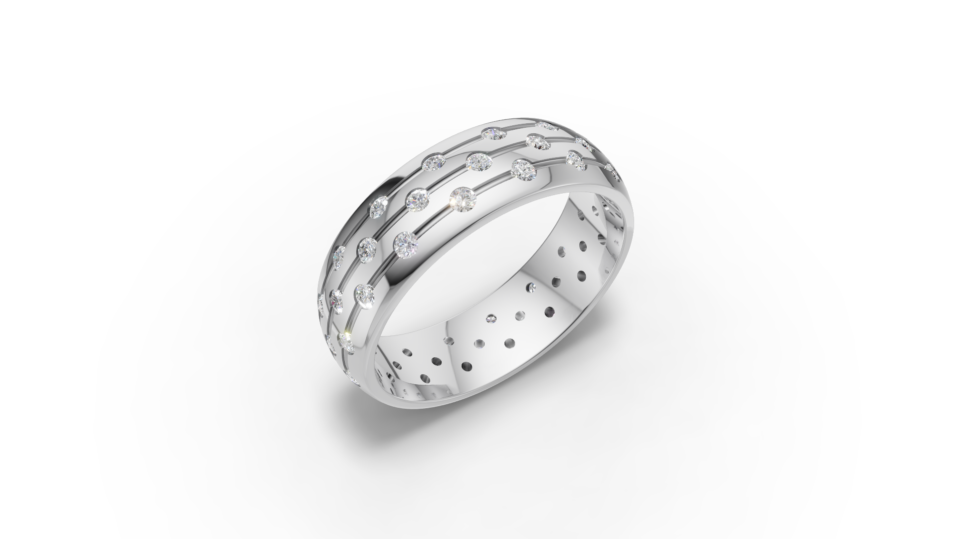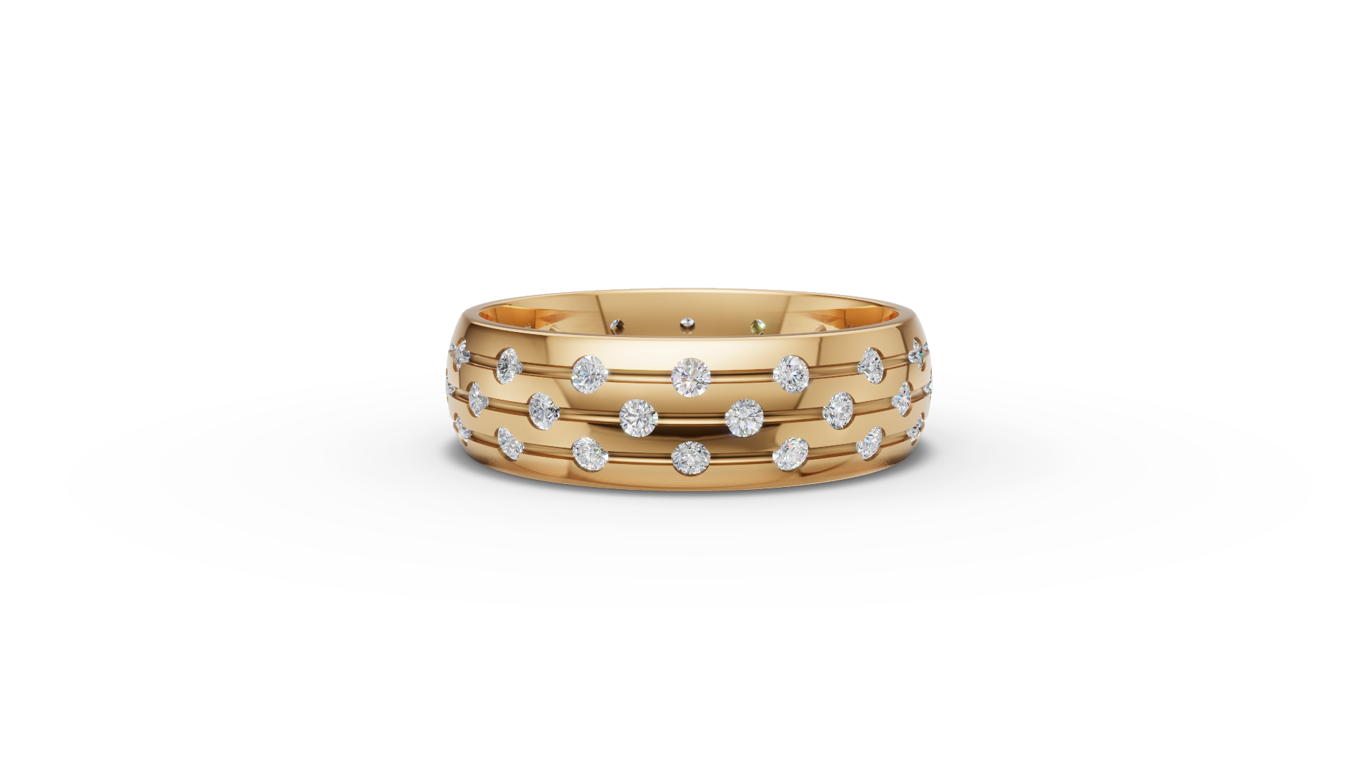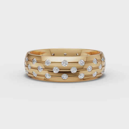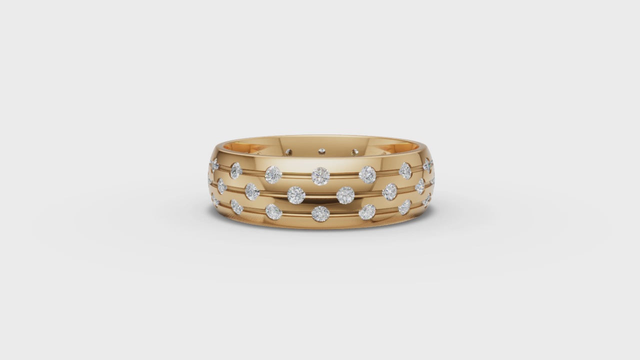 Make a dazzling statement with our Lillian Ring. This stunning design features three rows of sparkling round-cut moissanites, set in a wide band for maximum impact. The scattered pavé-style setting creates a mesmerizing play of light, giving this piece an effortless brilliance that’s both bold and elegant. Perfect for those who want to make a statement.